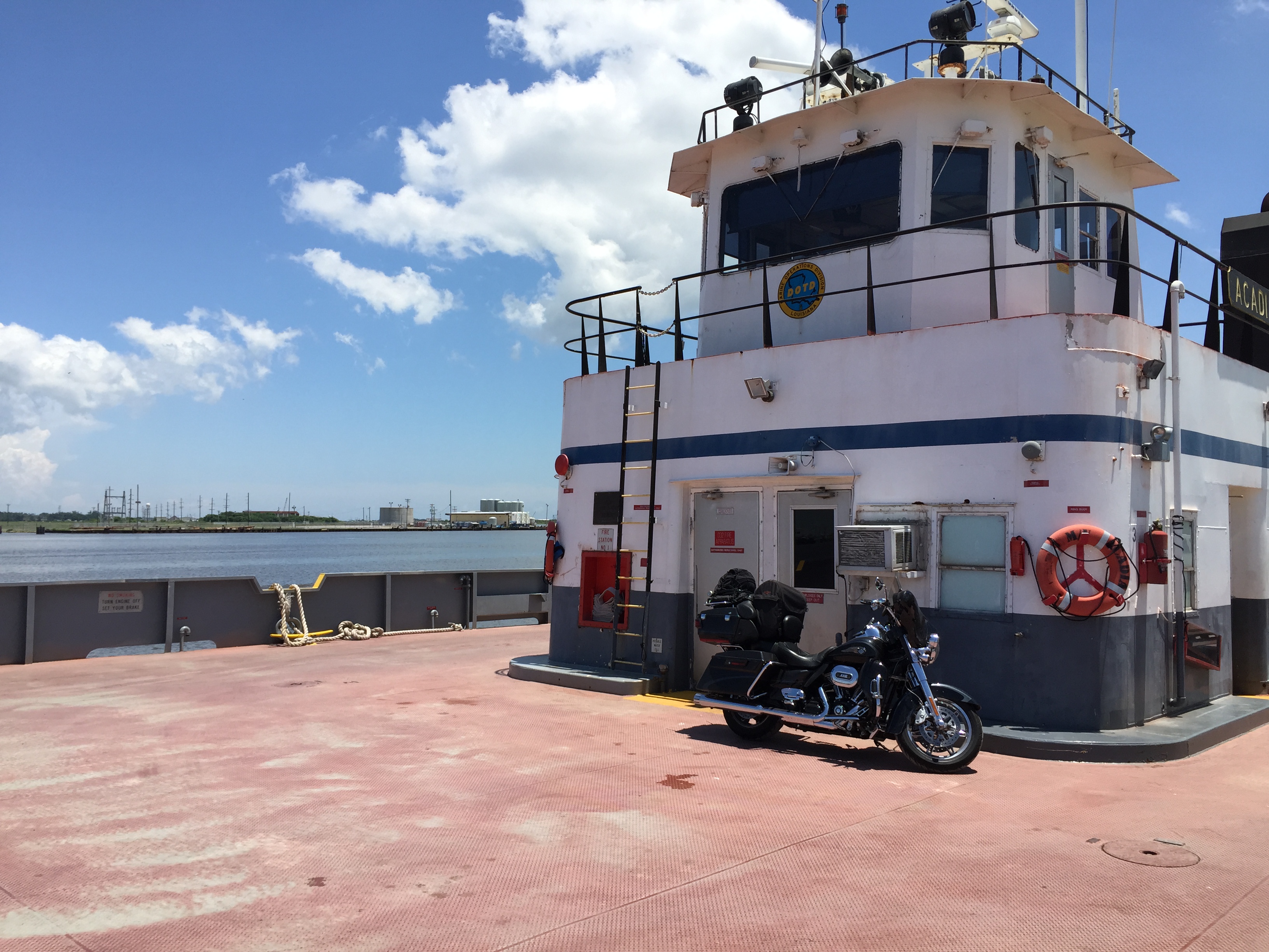 2015-06-01 13.42.26On the road from Holly Beach to the town of Cameron I made a turn and came upon what I anticipated to be a bridge crossing the channel. In stead it was a ferry, and a back-up ferry at that. Traffic was stopped waiting for the ferry to return from the other side, so I jumped off my Harley to ask the dump truck driver in front of me how the process worked. I wanted to make sure I’d be able to get my Harley on and off without incident. That’s how I met Jimmie, a very nice Cajun man from the Acadiana area of south Louisiana. He let me know the boarding process was simple, there was no fee, and assured me that the road to Abbeville was clear from the ferry on.