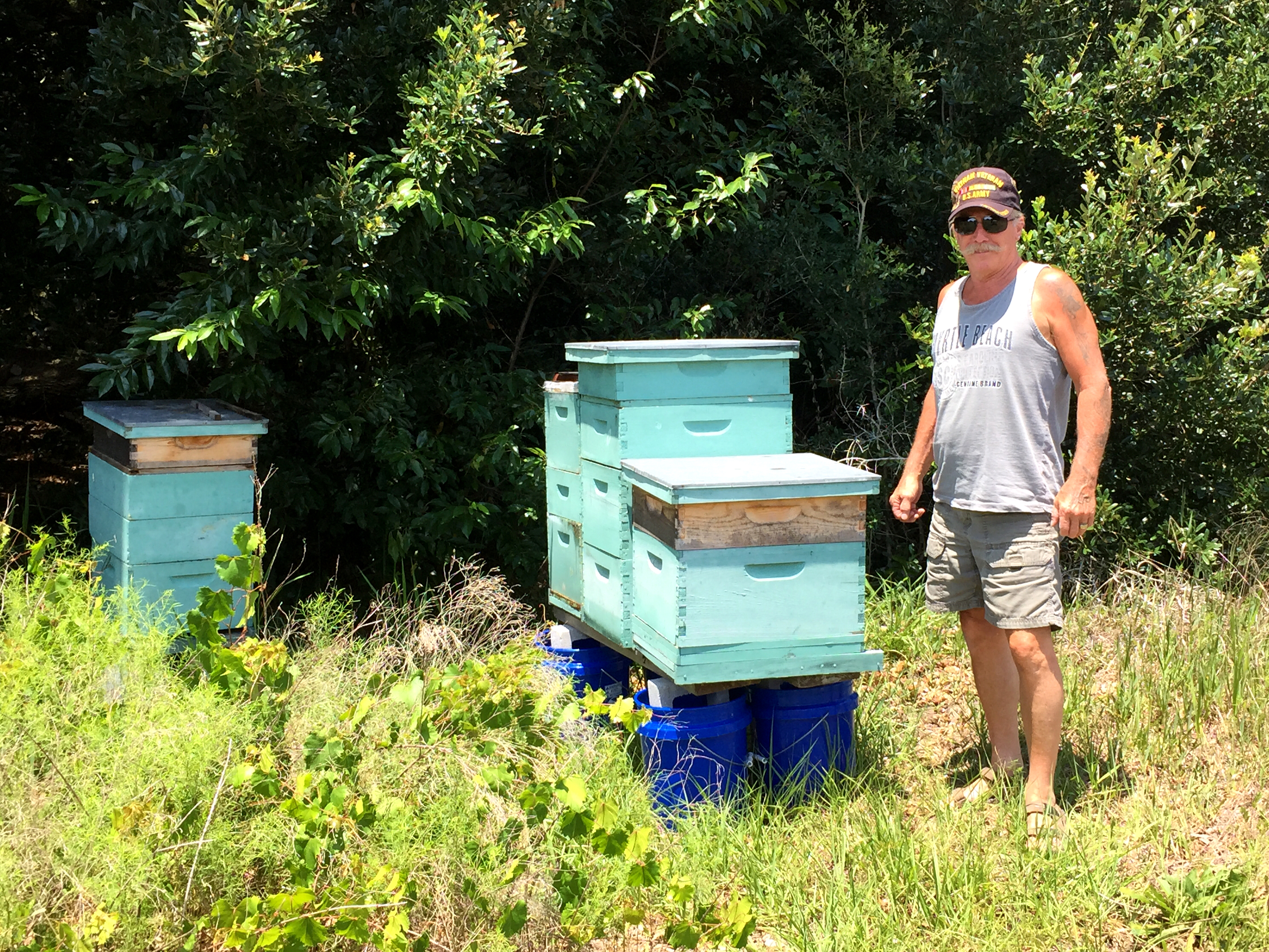 Debbie had to work today, so Rick was given the challenge of taking care of me. He is a skilled carpenter, veteran of the Vietnam War, and all around good guy. He drove me around their community, The Plantation, in a golf cart, the preferred method of transportation inside the community. It’s a wonderful place to live with great facilities, lots of organized activities, and some really nice neighbors. The manager of the place went the extra mile by letting Rick move his beehives onto a secluded place in the community when he and Debbie moved here about a year ago.