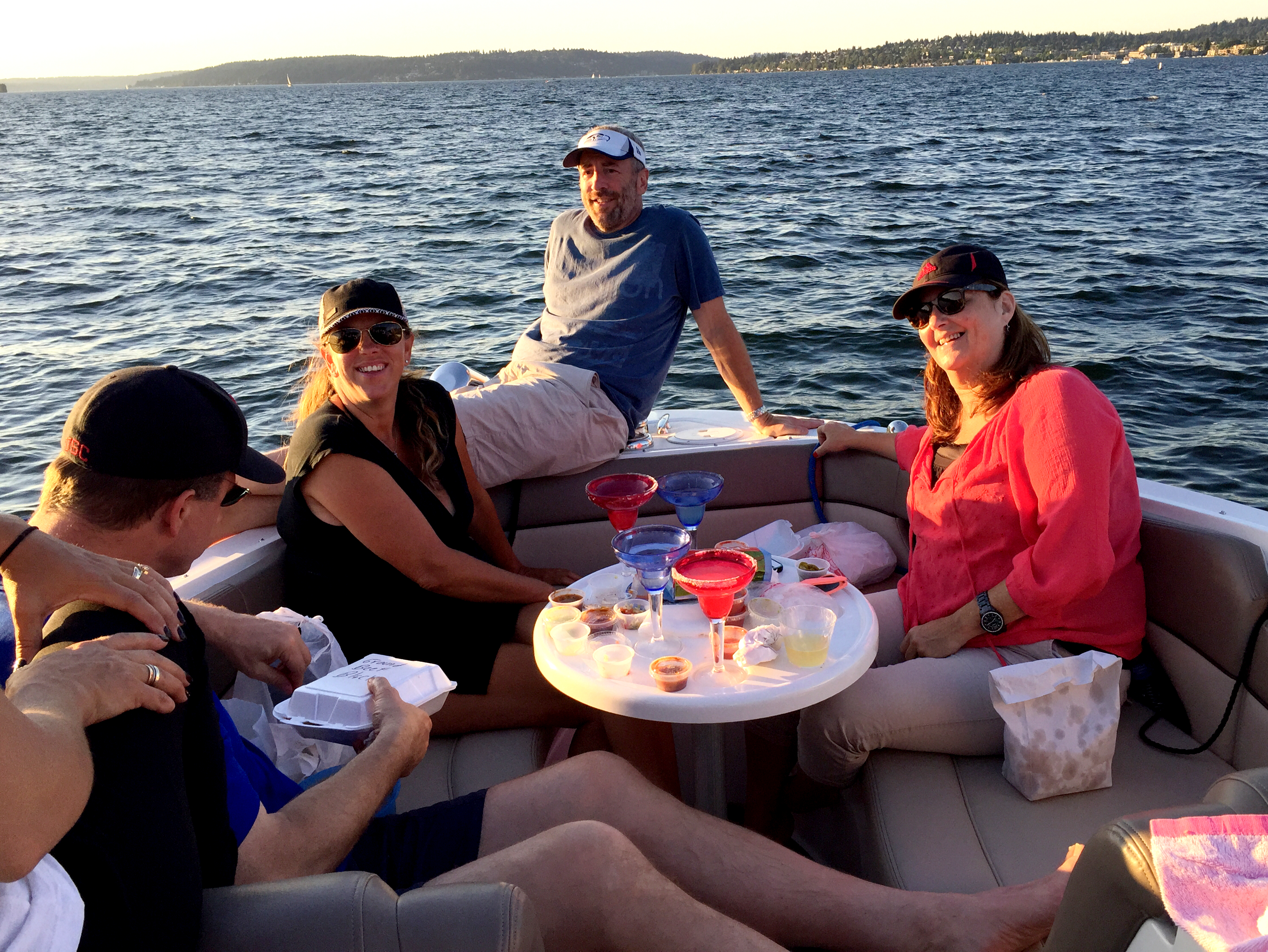 After a lunch break and quick stop for foot massages, we boated on Lake Washington with Tom and Tori’s friends John and Lisa, and their two daughters, Katie and Sarah. The lake is a beautiful place to boat, sail, swim, ski, or just drop anchor and hang out.