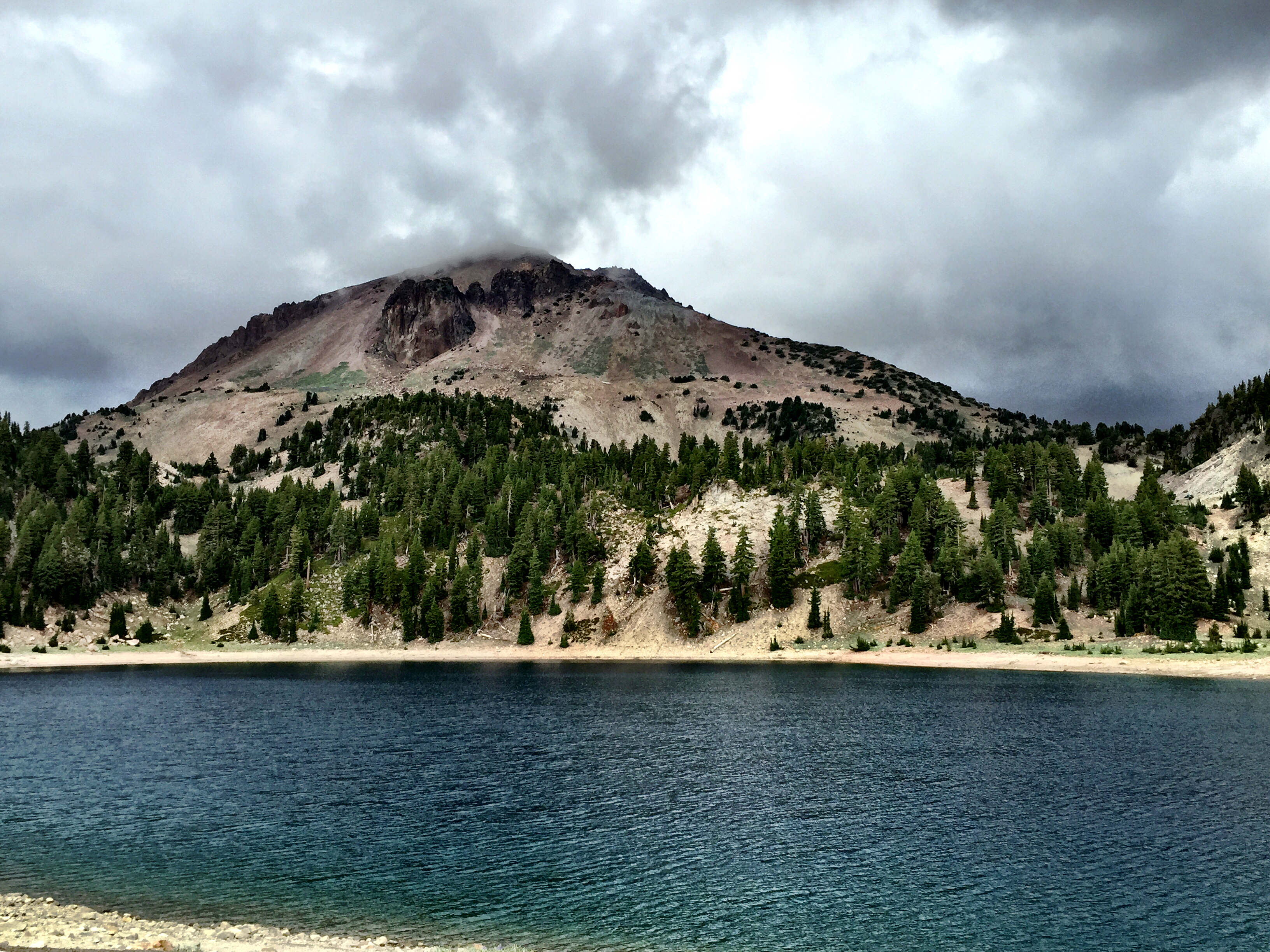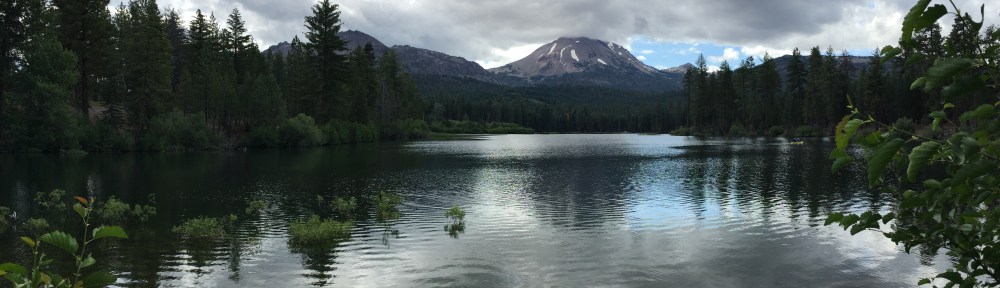 I continued south on 89 to Lassen Volcanic National Park. On the way I observed the destruction caused by the August 2014 Eiler Fire near Hat Creek. This will be the ninth and final visit to a national park on this ride. While I’ve been here many times, my perspective, altered by the many experiences I’ve had over the past 45 days, was different. Lassen Volcanic is the 37th ranked national park by number of visitors. Yet it is as beautiful and majestic as those ranked ahead of it. With only 400,000 visitors annually, Lassen Volcanic is one of the best-kept secrets of northern California. Today, with intermittent rain, wind, rapidly evolving cloud formations, it seemed more like Fall than Summer. The sun breaking through the clouds and flashing on specific scenes in the park appeared as God’s way of getting my attention. For example, I watched as Brokeoff Mountain was “featured” in brilliant sunlight with just a wisp of a cloud tickling its peak, and then it quickly disappeared into the shadows while the sun highlighted another small peak.